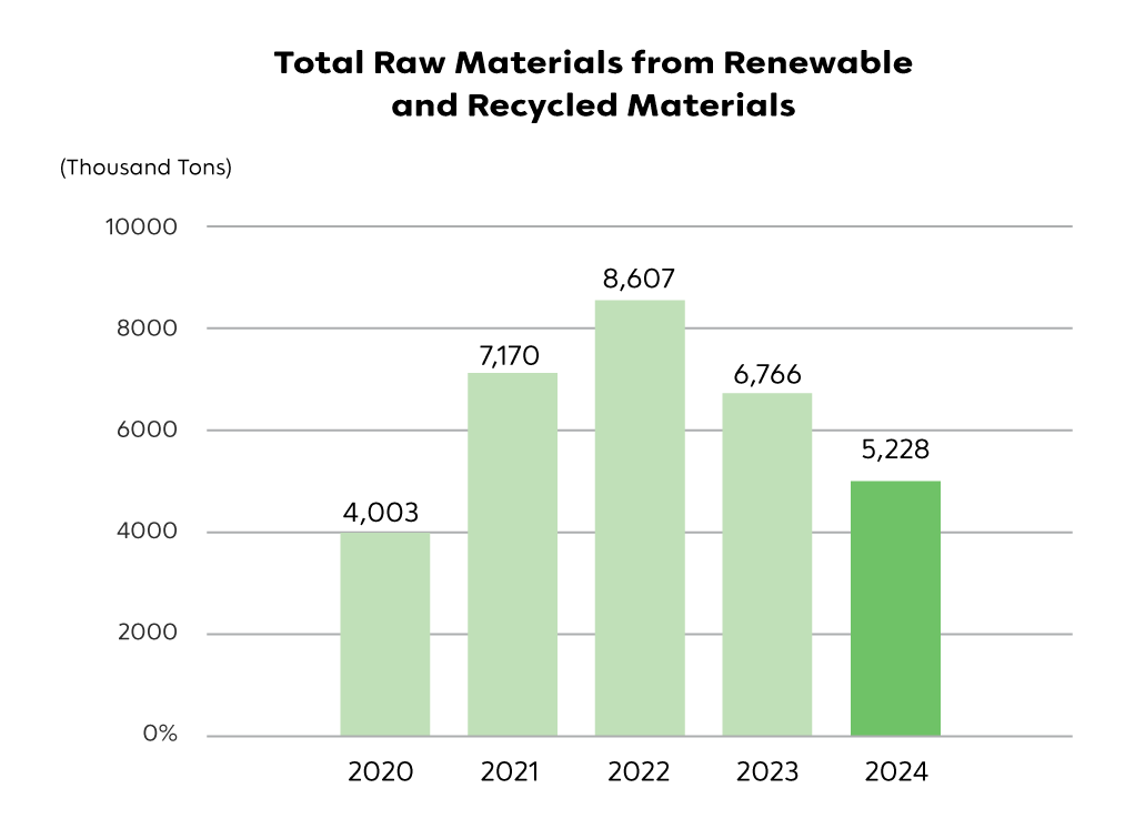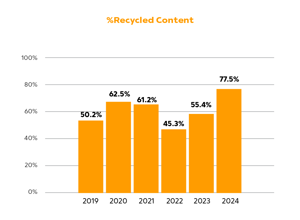 In 2024, the proportion of recycled contents reached 77.5%. The percentage was increased because some related portions of recycled materials were included. The overall percentage of recyclable and renewable materials utilized was 97.4% in 2024, as all paper is considered to be made from renewable resources.
