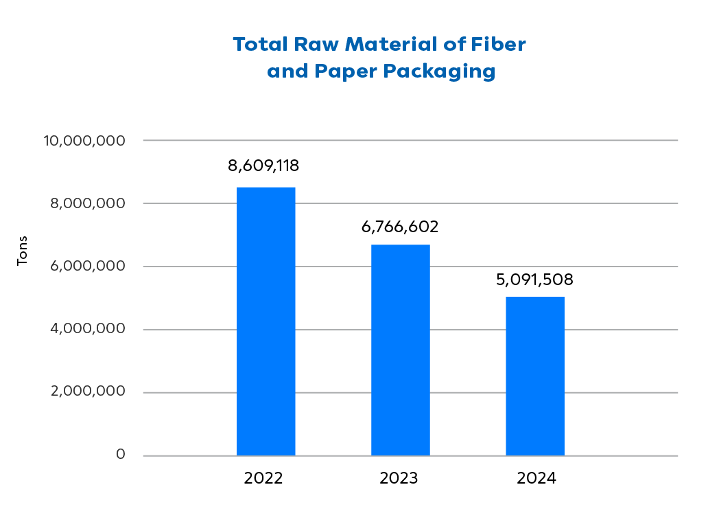 The raw materials used in the segment of fiber and paper packaging of SCGP typically include wood chips, virgin pulp, recycled paper and other natural fibers. These materials are processed and transformed into various types of packaging products, such as cardboard boxes, paper bags, and cartons. In 2024, SCGP utilized a total of 5,091,508 tons of raw materials for the production of fiber and paper packaging products.