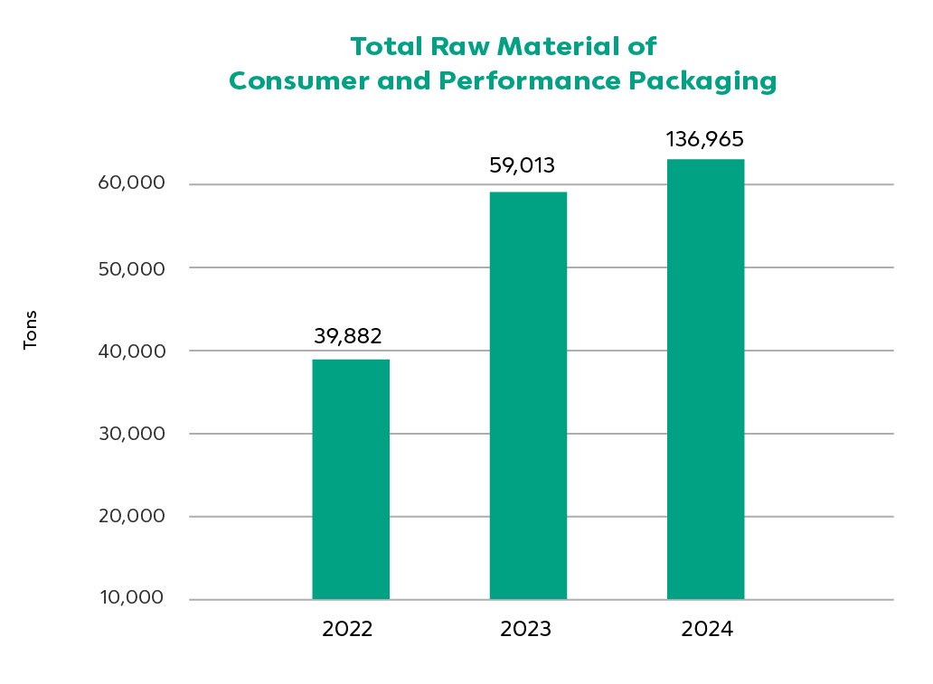 The total raw material of consumer and performance packaging refers to the overall amount of materials used in the production of various plastic packaging types such as flexible packaging, rigid packaging and high performance packaging. In 2024, the total raw material usage increased to 136,965 tons due to the data merging of Duy Tan Plastics Company Groups.
