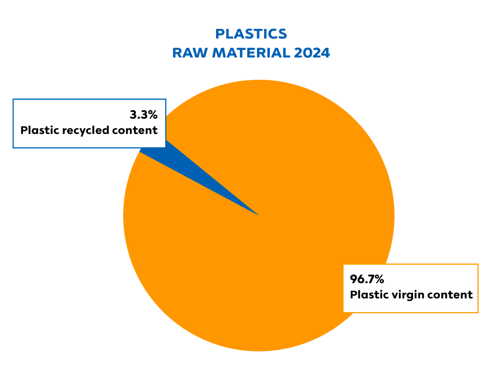 % Circular Inflow total is calculated based on the quantity of raw materials used in the production of goods, sourced from both internal and external suppliers, excluding packaging, chemicals used in the production support system, water, and energy. The Circular Inflow is composed of two components: