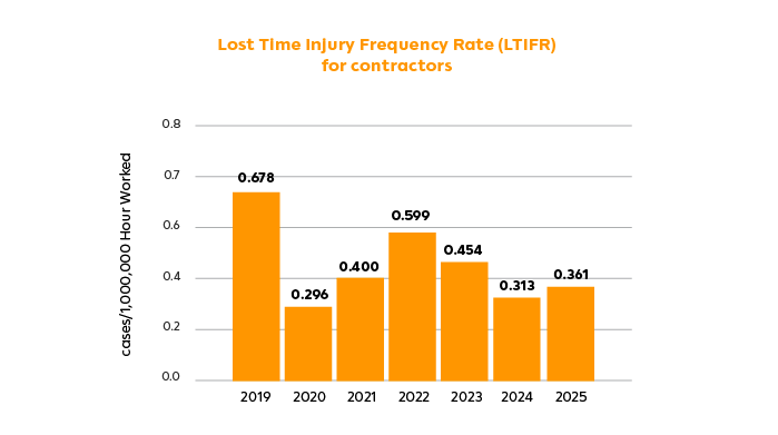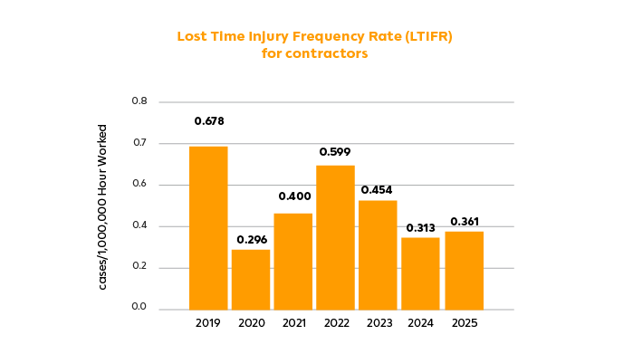 Zero Lost Time Injury Frequency Rate (LTIFR) of contractors (per 1,000,000 hours worked) within year 2030.