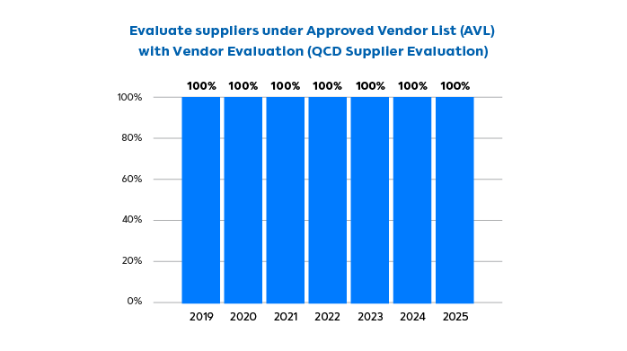 100% suppliers under Approved Vendor List (AVL) receive vendor evaluation (QCD Supplier Evaluation)