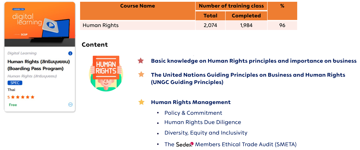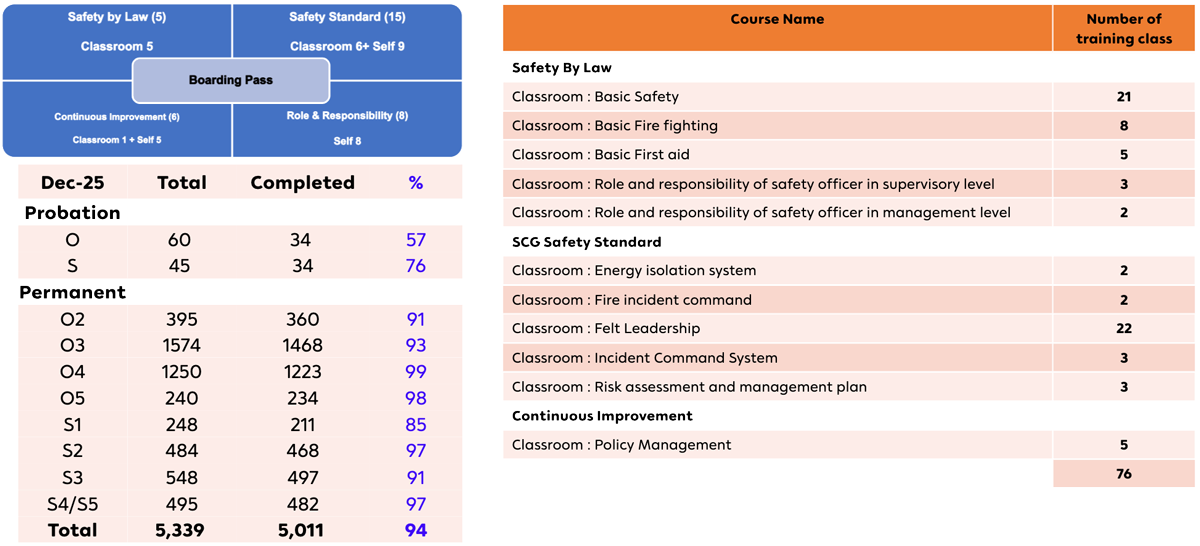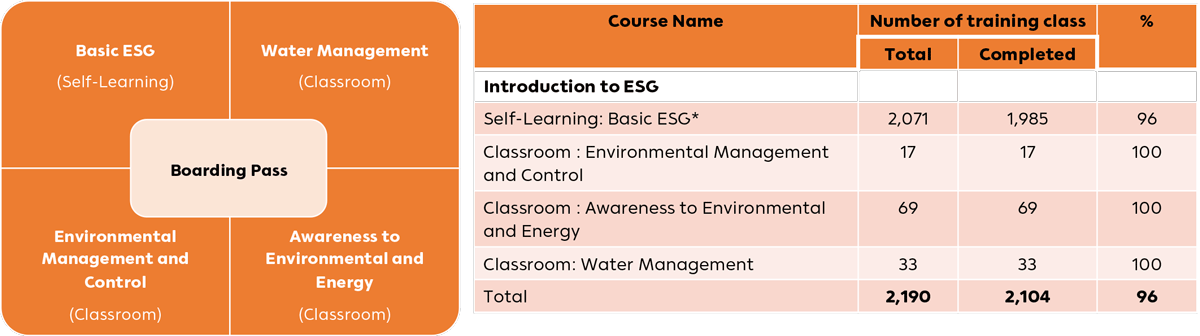 Remark: *Basic ESG is a course that teaches employees about SCGP's operations within the ESG framework. It includes policies, goals, strategies, data collection, and performance reporting, along with case studies in various categories. For example, the environmental category includes Energy management and Climate change, Water management, Waste management based on circular economy principles. The social category includes Health and Safety, Human Rights, Community Engagement and Development. The Governance category includes Product Stewardship, Chemical and Hazardous Substance Management, and Supply Chains Stewardship, among others.