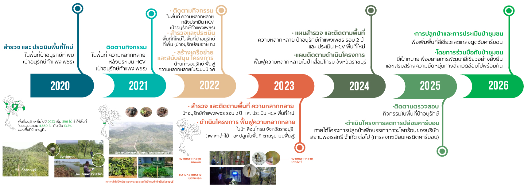 - การขยายพื้นที่ป่า: ขยายพื้นที่ป่าเพื่อเพิ่มความหลากหลายทางชีวภาพ และเพิ่มพื้นที่กักเก็บคาร์บอนไดออกไซด์ในชั้นบรรยากาศ ภายใต้มาตรฐานการลดการปล่อยก๊าซเรือนกระจก (Thailand Voluntary Emission Reduction Program: T-VER) ของประเทศไทย