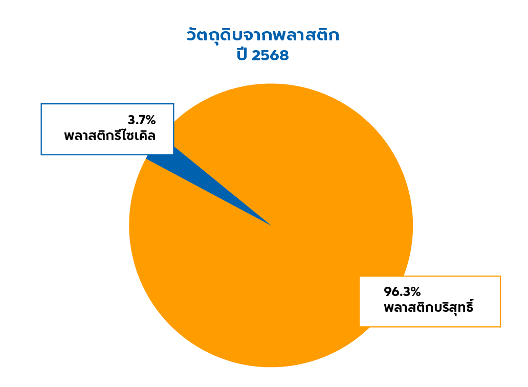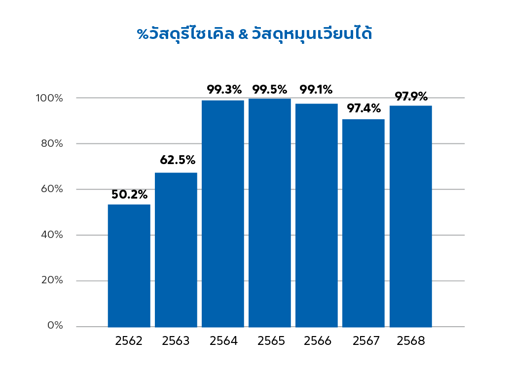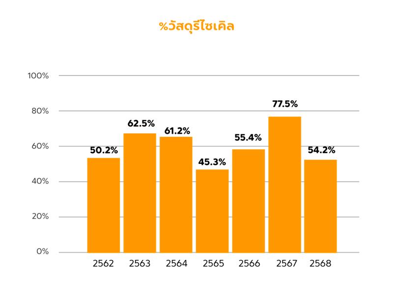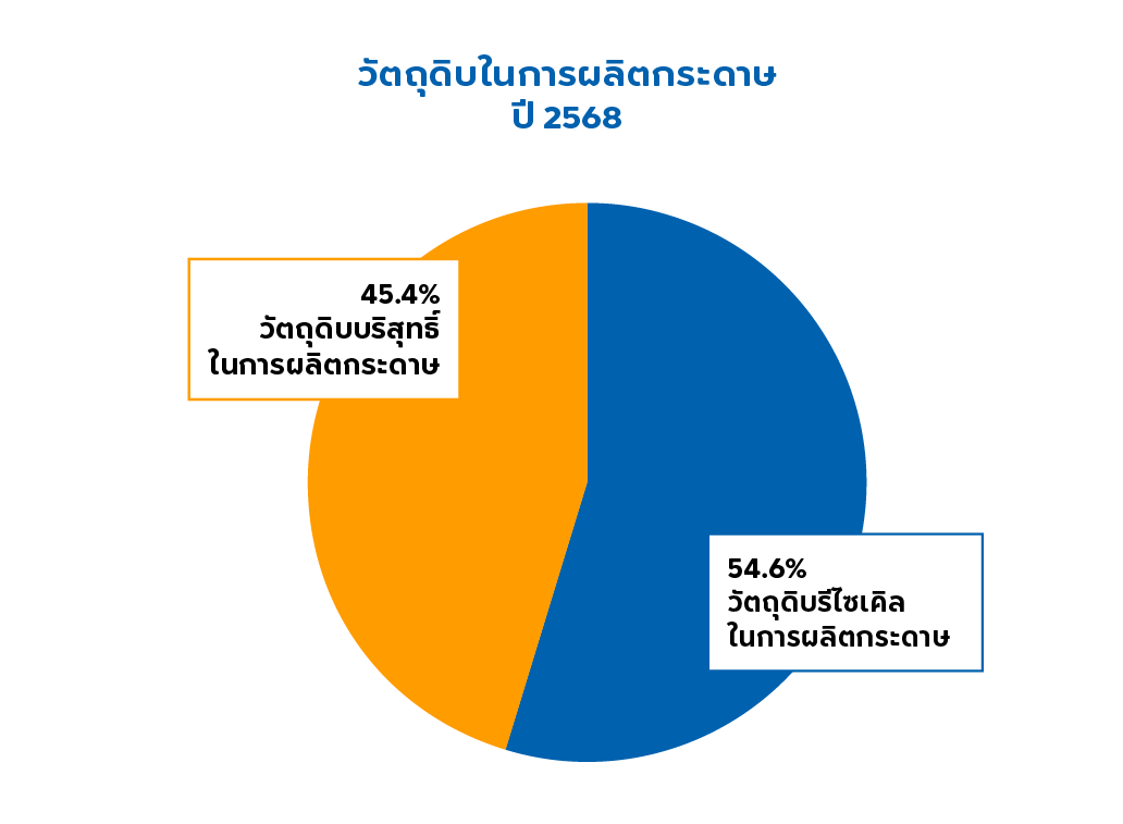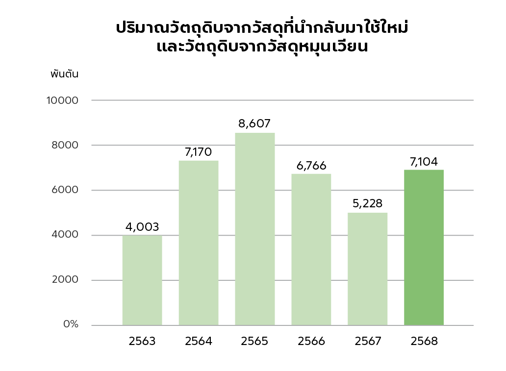ในปี 2568 สัดส่วนของวัสดุรีไซเคิลอยู่ที่ 54.2% เปอร์เซ็นต์ เปอร์เซ็นต์ในปี 2568 ต่ำกว่าปี 2567 เนื่องจากการนำแนวคิดข้อมูลแบบใหม่มาใช้ เพื่อหลีกเลี่ยงความซ้ำซ้อน ในส่วนของวัสดุรีไซเคิลและวัสดุหมุนเวียนได้ รวมกันได้ 97.9% ในปี 2568 เนื่องมาจากวัสดุเยื่อและกระดาษเป็นสัดส่วนหลักของการผลิต