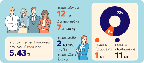 กฎบัตรคณะกรรมการบริษัท กำหนดให้กรรมการบริษัทดำรงตำแหน่งกรรมการในบริษัทจดทะเบียนอื่นรวมไม่เกิน 4 บริษัท ในปี 2568 จำนวนบริษัทจดทะเบียนอื่นที่กรรมการบริษัทที่ไม่ใช่ผู้บริหารดำรงตำแหน่งกรรมการ / ผู้บริหาร ไม่เกิน 4 บริษัท ดังแสดงในตารางด้านล่าง.