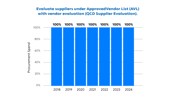 100% suppliers under Approved Vendor List (AVL) receive vendor evaluation (QCD Supplier Evaluation)