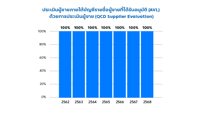ผู้ขาย 100% ภายใต้บัญชีรายชื่อผู้ขายที่ได้รับอนุมัติ (AVL) ได้รับการประเมินผู้ขาย (QCD Supplier Evaluation)