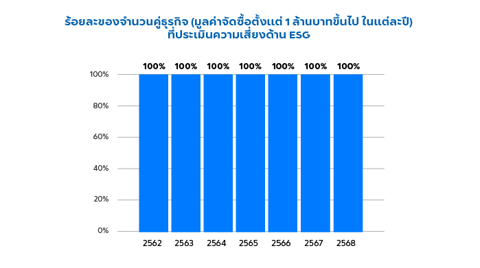 คู่ธุรกิจร้อยละ 100 ของมูลค่าการจัดหา ผ่านการประเมินความเสี่ยงด้านสิ่งแวดล้อม สังคม และบรรษัทภิบาล ในทุกปี