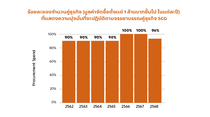 | คู่ธุรกิจร้อยละ 100 ของมูลค่าการจัดหา แสดงความมุ่งมั่นที่จะปฏิบัติตามจรรยาบรรณคู่ธุรกิจ SCGP | ร้อยละ 96 |