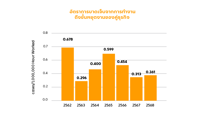 อัตราการบาดเจ็บจากการทำงานถึงขั้นหยุดงานของคู่ธุรกิจ เท่ากับ 0 ราย / 1,000,000 ชั่วโมงการทำงาน ภายในปี 2573