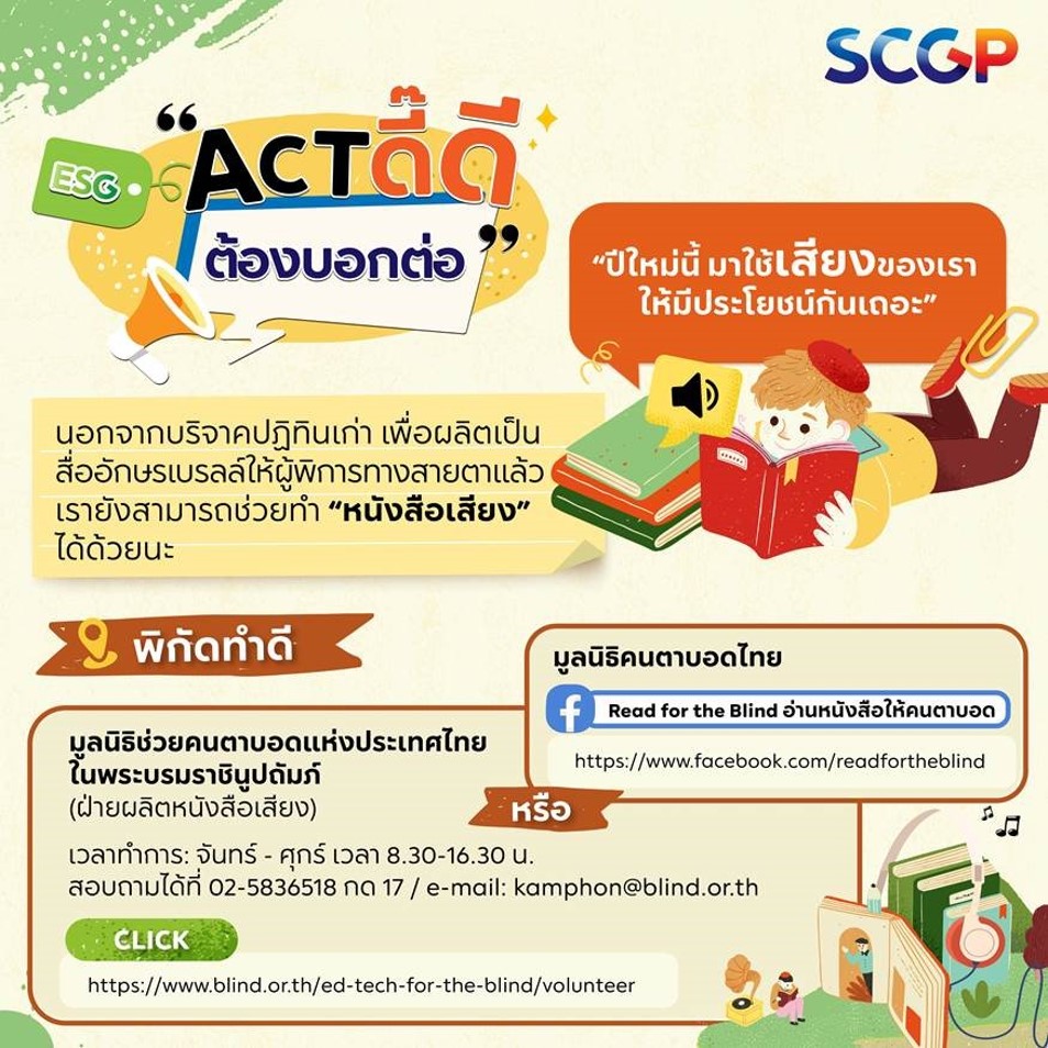 - เพื่อสนับสนุน DEI ในสังคม SCGP อนุญาตให้พนักงานเข้าร่วมกิจกรรมต่างๆ เช่น โครงการอ่านหนังสือเพื่อคนตาบอด