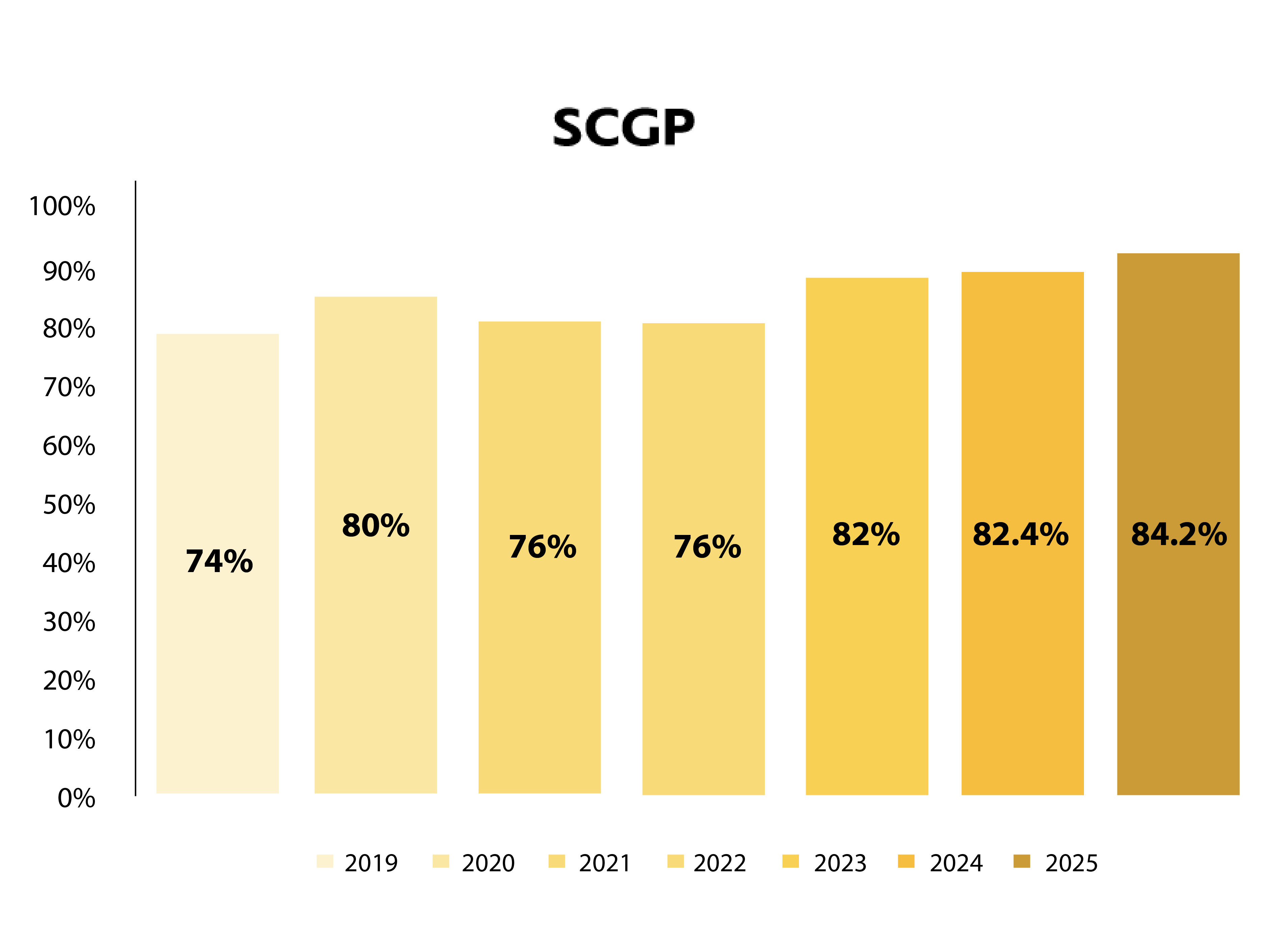- SCGP ใช้โมเดล Q12 Inner Drive ของ Gallup เป็นกรอบแนวทางในการวัดความผูกพันของพนักงาน โดยคะแนนจะถูกวัดตามมาตราส่วนการให้คะแนนแบบ Rating