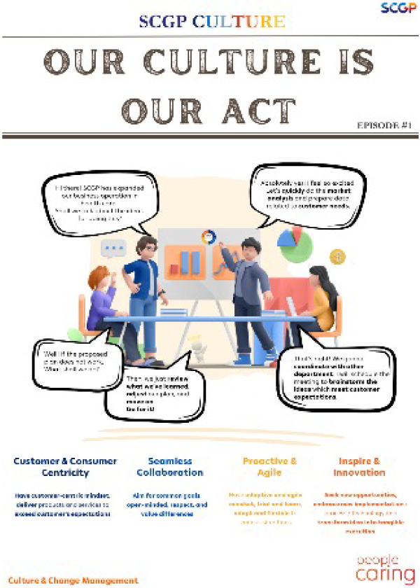 การศึกษาวัฒนธรรมองค์กร: วัฒนธรรมองค์กรถูกถ่ายทอด สื่อสารเพื่อการเรียนรู้ผ่านช่องทางต่างๆ เช่น อีเมล และการฝึกอบรม ทั้งในรูปแบบออนไลน์ผ่านระบบ OCAP และในสถานที่ผ่านโปรแกรมต่างๆ ตัวอย่างเช่น ใน โครงการพัฒนาภาวะผู้นำ (Leader Development Program) จะมุ่งเน้นที่การส่งเสริมวัฒนธรรมที่กระตุ้นพฤติกรรมเชิงบวกภายในทีม เช่น การสร้างสภาพแวดล้อมที่ดี มีความครอบคลุม และความร่วมมือ เพื่อให้แน่ใจว่าการกระทำในแต่ละวันและแนวทางความเป็นผู้นำสอดคล้องกับวัฒนธรรมและพฤติกรรมที่คาดหวังของ SCGP