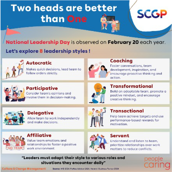 - โครงการพัฒนาภาวะผู้นำ (Leadership Development Program) : โครงการพัฒนาทักษะความเป็นผู้นำเริ่มต้นจาก การเป็นผู้นำตนเอง โดยมุ่งเน้นการปลูกฝังทัศนคติแบบเติบโต (Growth Mindset) ร่วมกับวัฒนธรรมของ SCGP ผ่านเวิร์กช็อปและกิจกรรมต่างๆ เช่น การเรียนรู้ Enneagram เพื่อเสริมสร้างการตระหนักรู้ในตนเอง ซึ่งจะนำไปสู่การสื่อสารที่มีประสิทธิภาพมากขึ้น การเข้าใจความหลากหลาย และการปรับตัวในสภาพแวดล้อมการทำงานได้ดีขึ้น หลังจากจบช่วง Self Lead (โปรแกรม WE) ผู้เข้าร่วมจะเข้าสู่ระยะ Team Lead (โปรแกรม WE Plus) ที่เน้นการสร้างทีม การบริหารการเปลี่ยนแปลง การสื่อสารอย่างมีประสิทธิภาพ การโค้ช การให้ข้อเสนอแนะ และการจัดลำดับความสำคัญ เพื่อส่งเสริมความเข้าใจและความร่วมมือทั้งภายในทีมและระหว่างทีม
