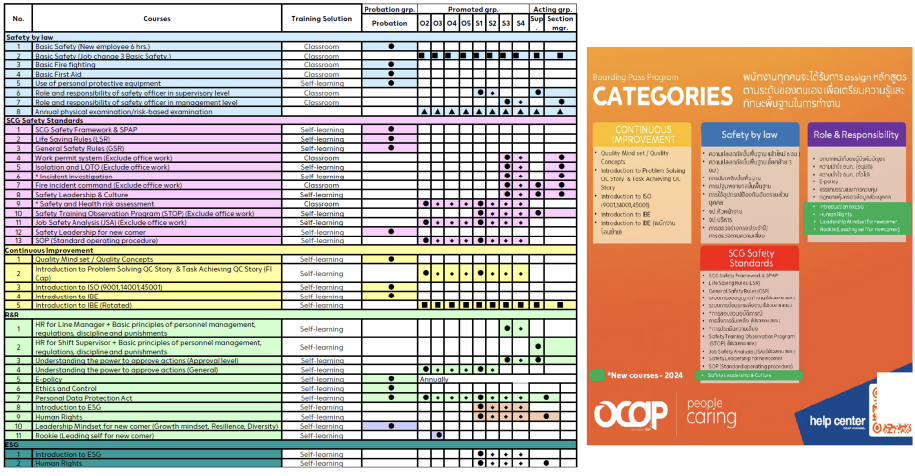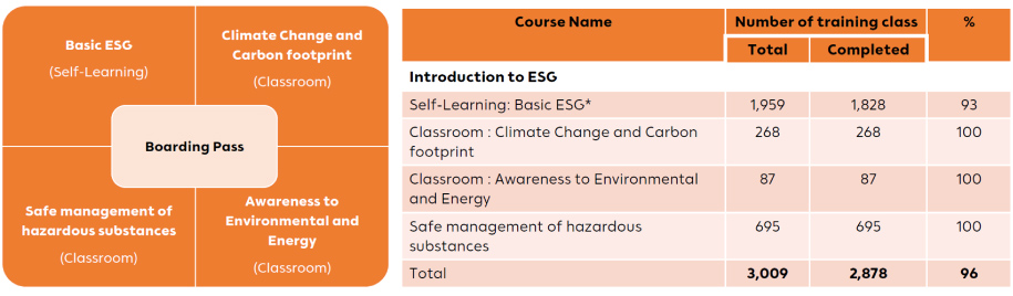 หมายเหตุ: *หลักสูตร Basic ESG เป็นหลักสูตรที่ให้ความรู้แก่พนักงานเกี่ยวกับการดำเนินงานของ SCGP ภายใต้กรอบแนวคิด ESG โดยครอบคลุมนโยบาย เป้าหมาย กลยุทธ์ การเก็บรวบรวมข้อมูล และการรายงานผลการดำเนินงาน รวมถึงกรณีศึกษาต่าง ๆ ในแต่ละหมวด เช่น หมวดสิ่งแวดล้อม: การจัดการพลังงานและการเปลี่ยนแปลงสภาพภูมิอากาศ, การจัดการน้ำ, การจัดการของเสียตามหลักเศรษฐกิจหมุนเวียน หมวดสังคม: สุขภาพและความปลอดภัย, สิทธิมนุษยชน, การมีส่วนร่วมและพัฒนาชุมชน หมวดธรรมาภิบาล: การดูแลผลิตภัณฑ์, การจัดการสารเคมีและวัตถุอันตราย, และการดูแลห่วงโซ่อุปทาน เป็นต้น