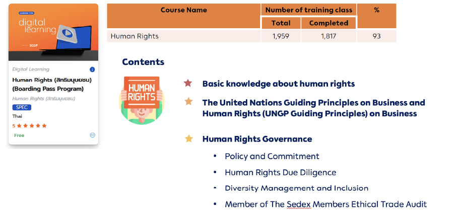 ในปี 2567 พนักงานระดับบังคับบัญชาของ SCGP ร้อยละ 93 ได้รับการฝึกอบรมในประเด็นเฉพาะด้านสิทธิมนุษยชนแล้ว